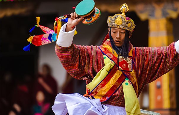 During the Takthok Tsechu festival, monks perform sacred Cham dances representing protector deities and spiritual guardians.